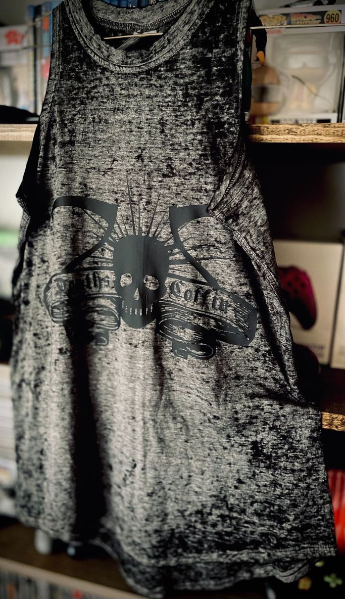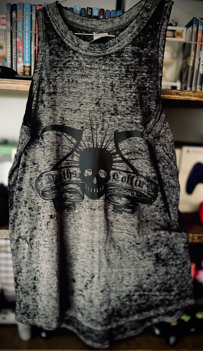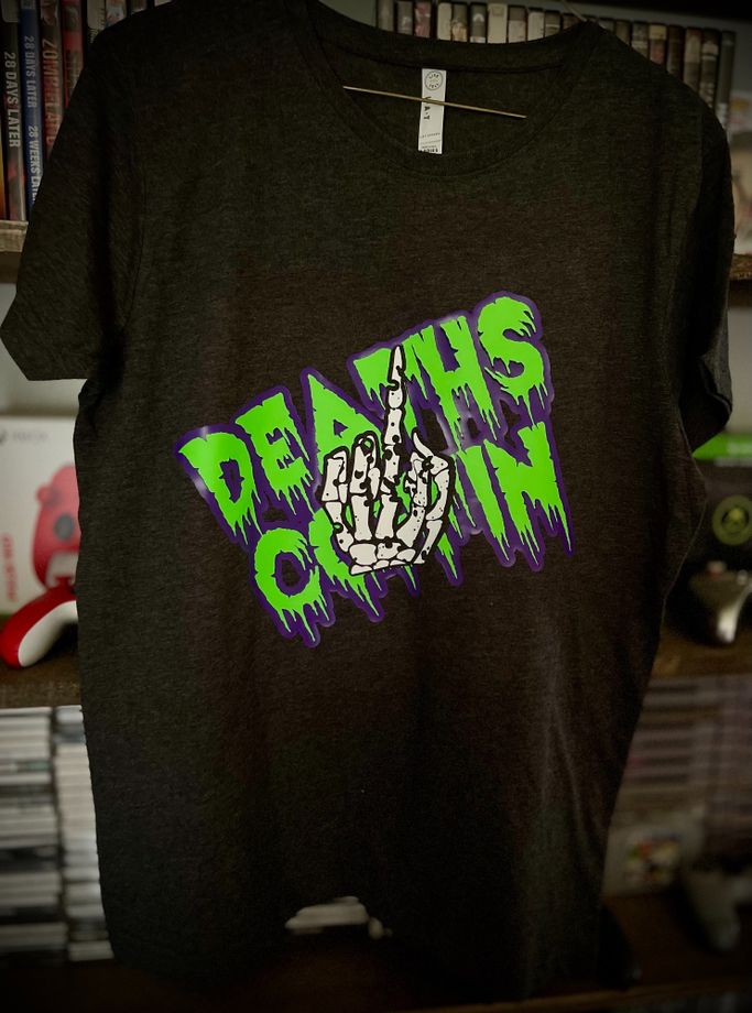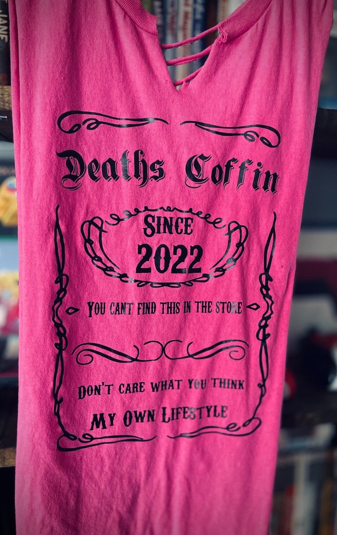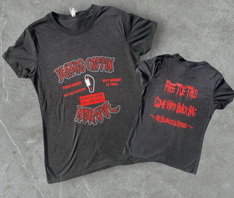 Deaths Coffin Morgue done in red and grey HTV with design on front and back.