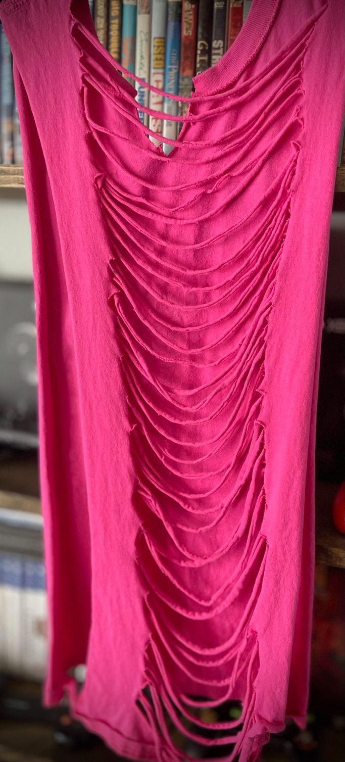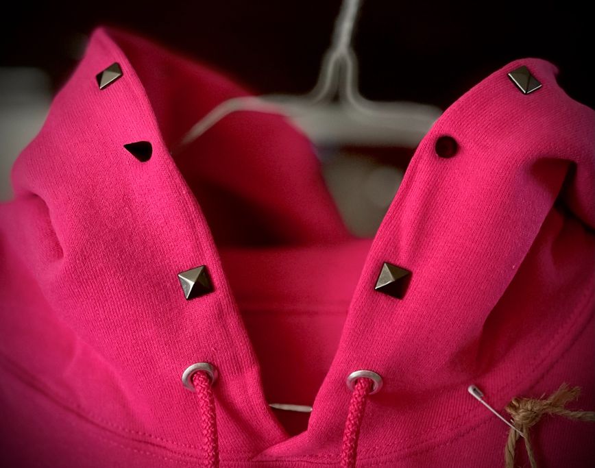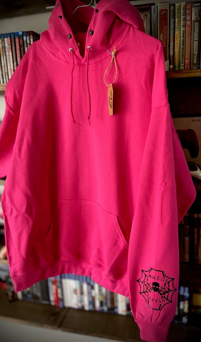 Soft pink hoodie with black graphic on back and small black spikes and pyramids along hood.