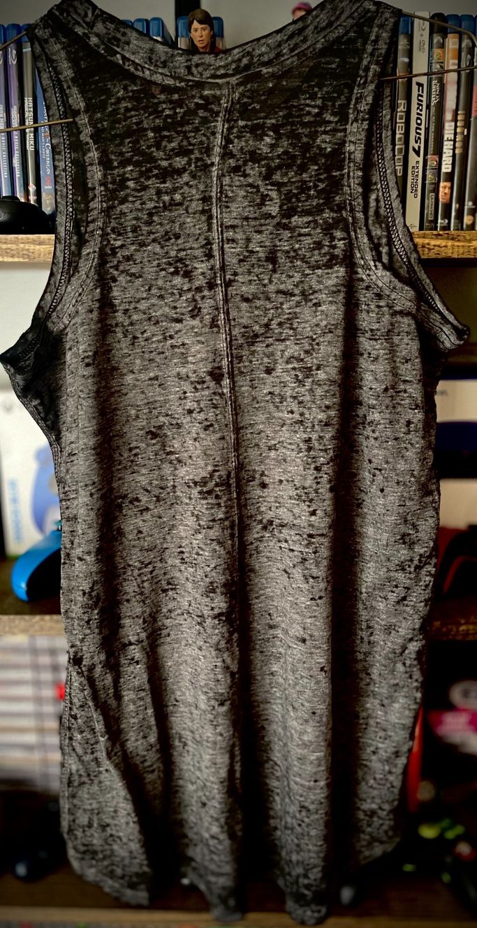 Soft comfy tri-blend black and grey tank top with black logo on front.